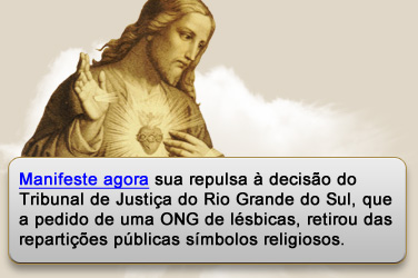 Olá, Saiu esta semana nos jornais, um absurdo que afronta a Nosso Senhor Jesus Cristo e a todos os católicos. Você viu?  | | | “O Tribunal de Justiça do Rio Grande do Sul (TJ-RS) determinou nesta terça-feira a retirada dos crucifixos e símbolos religiosos nos espaços públicos dos prédios da Justiça gaúcha. A decisão foi uma resposta ao pedido da Liga Brasileira de Lésbicas”. (Jornal Zero Hora) | | | |  | Agora pense comigo. Esta atitude de expulsar Cristo das repartições públicas é coisa de quem não gosta de Nosso Senhor Jesus Cristo e tudo que é relacionado a Ele, não é mesmo? E isso tem nome, chama-se: CRISTIANOFOBIA, que quer dizer repulsa ao cristianismo. É inconcebível que uma pequena parcela da população, ínfima, para ser mais exata, possa ter tanto prestígio frente ao Tribunal de Justiça, quando a maioria dos brasileiros é cristã e católica. Por isso, deixe aqui sua opinião em relação a este absurdo que fizeram quando atenderam ao pedido da Liga Brasileira de Lésbicas. Basta você deixar registrado nessa página que não concorda com a decisão do Tribunal de Justiça do Rio Grande do Sul. Faça isso como ato de reparação ao Sagrado Coração de Jesus. Não vamos permitir que expulsem Nosso Redentor de lugares onde certamente Sua presença serve como refrigério a muitas pessoas. Que o Sagrado Coração de Jesus abençoe você e sua família. Elza Maria Franco Soares Vice presidente da Associação Apostolado do Sagrado Coração de Jesus www.aascj.org.br |