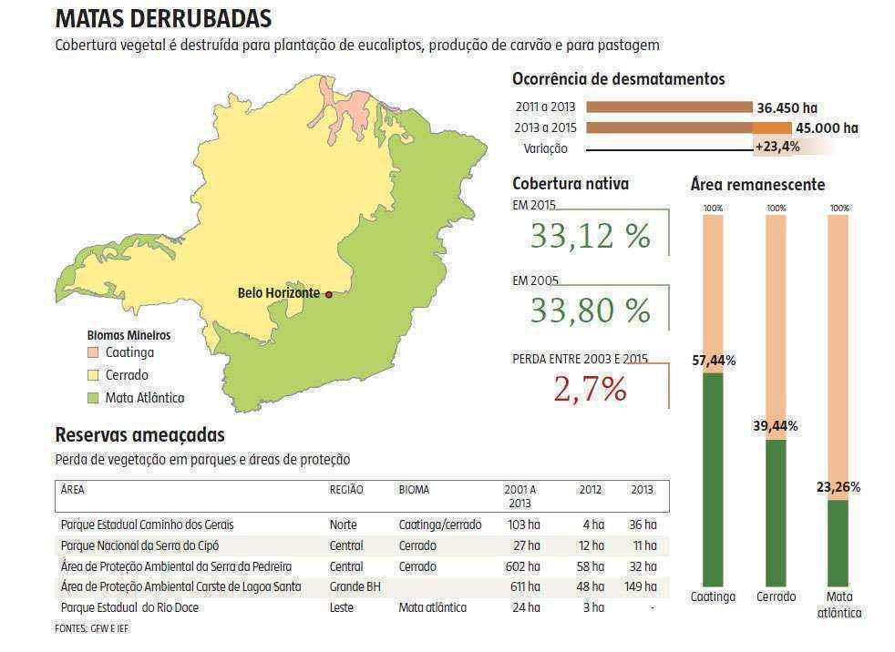 Na comparação com a cobertura vegetal de 2003, Minas perdeu 2,7% de sua área de florestas nativas. A devastação também ocorre nas unidades de conservação, como o Parque Estadual Caminho dos Gerais, única área de proteção da caatinga, no Norte de Minas, que perdeu